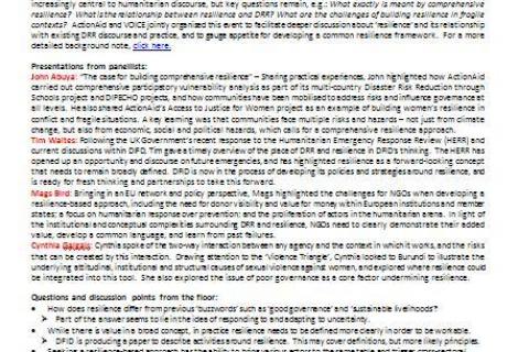On 23rd June 2011, ActionAid and VOICE (Voluntary Organisations in Cooperation in Emergencies) hosted a panel discussion entitled From Disaster Risk Reduction to Comprehensive Resilience - Towards a Common Understanding.  The event focused on the increasing debate and discussion around the meaning of "resilience" as a concept for reducing people's vulnerability to hazards.  It also looked at the relationship between resiliance and existing discourse and practice on Disaster Risk Reduction (DRR), as well as trying to guage appetite for developing a common resilience framework.