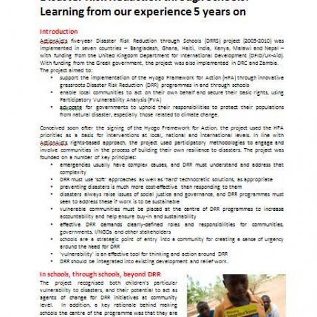 Disaster Risk Reduction through Schools; learning from our experience 5 years on